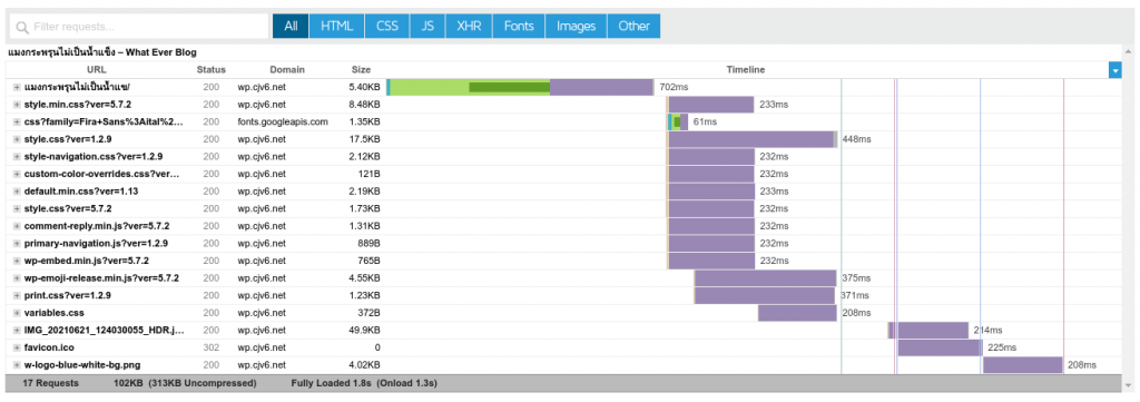 นี่คือกรณีที่ไม่ได้ใส่ histat เอาไว้ในส่วนของ footer จำนวน request เท่ากับ 17 เวลาที่ใช้ในการ load เท่ากับ 1.8 วินาที