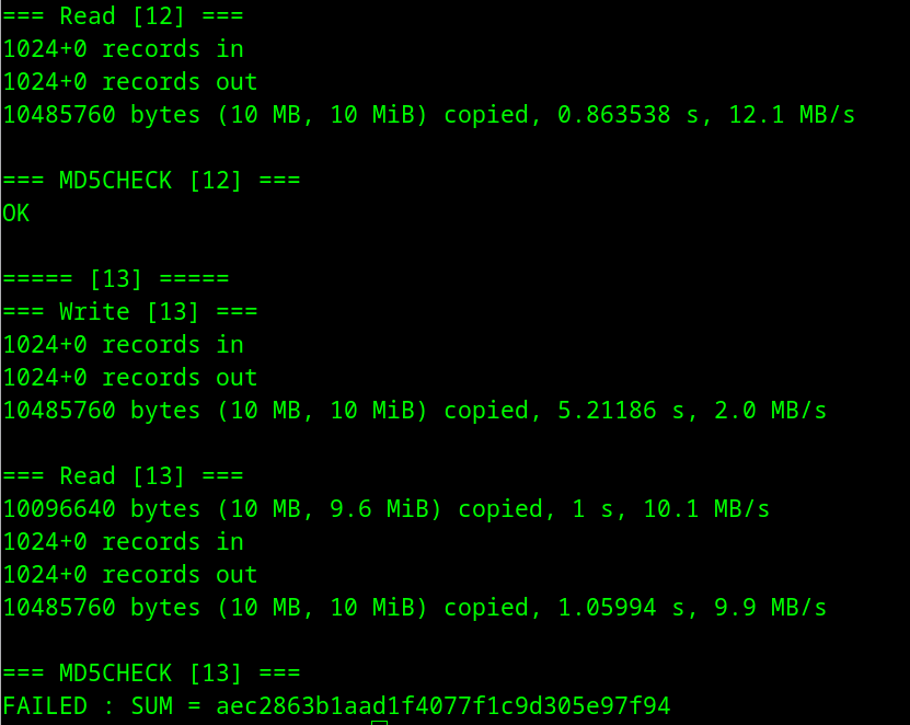 ก็เลยลองเขียน script เพื่อทดลอง เขียนเป็น block ขนาด block ละ 10MB แล้วอ่านกลับ แล้วเอา md5sum ตรวจสอบดู